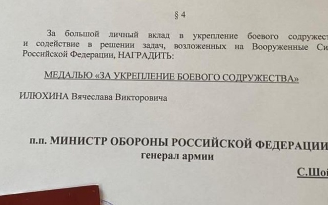 Вячеслав Илюхин награжден медалью "За укрепление боевого содружества". Награду депутат Заксобрания Новосибирской области от партии "РОДИНА", как указано в выписке из приказа министра обороны Сергея Шойгу, получил "за большой личный вклад в укрепление боевого содружества и содействие в решении задач, возложенных на Вооружённые силы Российской Федерации".