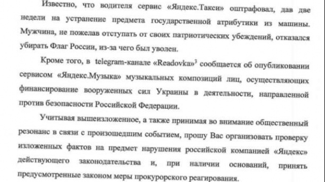 Компания "Яндекс" оказалась в центре громкого скандала, разбираться в котором придется Генпрокуратуре РФ. Поводом стало решение "Яндекс. Такси" запретить водителям вывешивать у себя в авто российские флаги и другую патриотическую символику. Кроме того, в сервисе "Яндекс. Музыка" до сих присутствуют композиции артистов, критикующих действия РФ на Украине и отправляющих донаты на нужды ВСУ.