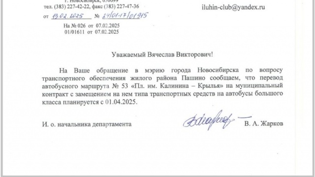 Департамент транспорта и дорожно-благоустроительного комплекса мэрии Новосибирска в ответе на запрос депутата Законодательного Собрания региона от партии "РОДИНА" Вячеслава Илюхина официально подтвердил перевод автобусного маршрута №53 на муниципальный контракт.