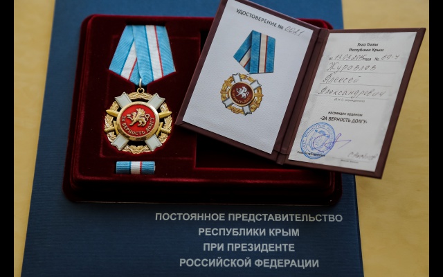 "В соответствии со ст. 65 Конституции Республики Крым постановляю, за Мужество, Патриотизм, активную общественно-политическую деятельность, за личный вклад в укрепление Единства развития, процветания Республики Крым и в связи с днём воссоединения Крыма с Россией наградить орденом "За верность долгу" Журавлёва Алексея Александровича», - следует из текста Указа Главы Республики Крым.