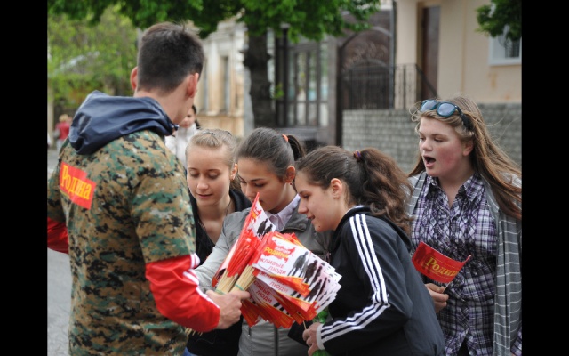 Молодые ребята поздравляли всех симферопольцев с Днем Победы, вручали флажки с уже узнаваемыми всеми крымчанами "вежливыми людьми" и георгиевские ленточки, а ветеранам вместе со словами благодарности дарили красные гвоздики. После акции партийная колона родинцев приняла участие в шествии к мемориалу "Могила неизвестного солдата". Там ребята возложили цветы на Аллею славы и к Вечному огню, почтили минутой молчания память погибших героев, которые 70 лет назад освободили нашу Родину - Крым - от фашизма.
