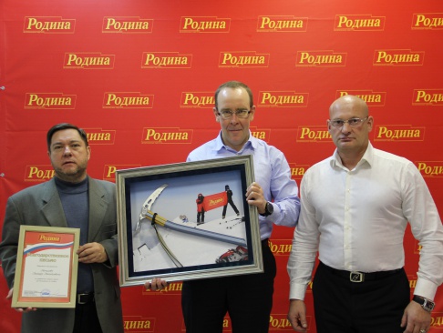 В торжественной обстановке председатель Совета Самарского регионального отделения партии "РОДИНА" Сергей Мирошниченко вручил Леониду Мочалову изготовленный по специальному заказу памятный подарок и благодарственное письмо за продвижение имиджа партии "РОДИНА" при восхождении на Эльбрус.